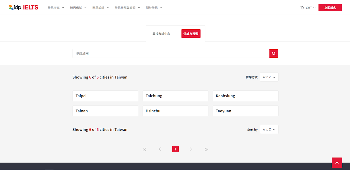 在考試查詢頁選擇理想的考試城市,目前 IDP 雅思在台北、桃園、新竹、台中、台南及高雄等六個城市設有考場。