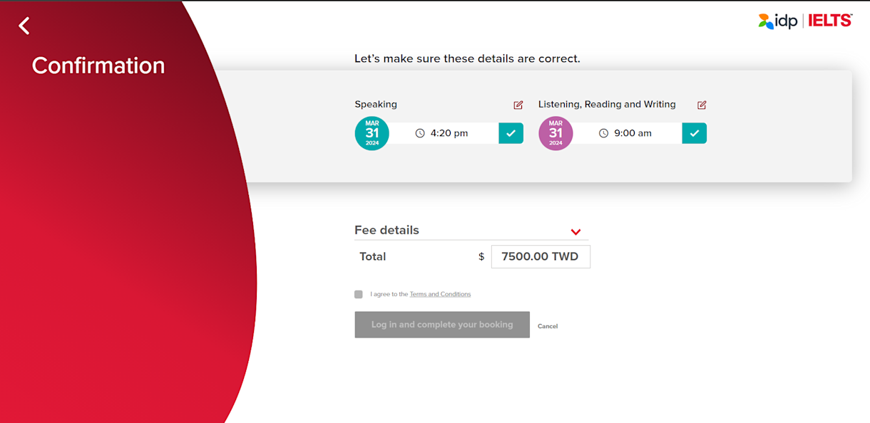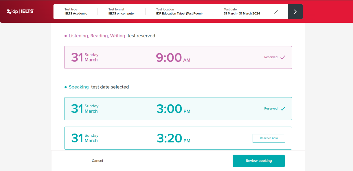 選擇理想的考試場次後,可以在進一步選擇口試時間,確定後按下 Review Booking 進入付款。
