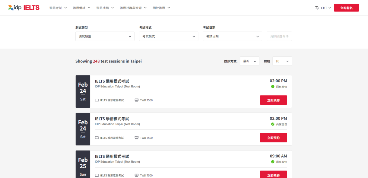 你可以透過調整篩選器,調整考試日期、考試類型以及希望的考試模式,更快幫助你找到適合的考試場次。
