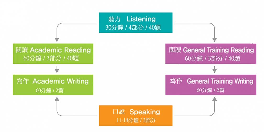 雅思與英國簽證雅思一樣由 4 個部分組成:聽力、閱讀、寫作與口說,且同樣可分為(學術組)與(一般訓練組)兩個組別。