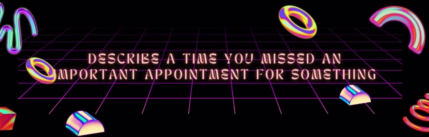 Đây là một chủ đề thuộc dạng Narrative (Kể chuyện), yêu cầu thí sinh kể lại một trải nghiệm cá nhân. Chủ đề này không quá khó nhưng đòi hỏi bạn phải xây dựng các luận điểm chặt chẽ để làm nổi bật sự kiện, lý do và hậu quả. Bạn nên chọn một cuộc hẹn mà việc bỏ lỡ nó có hậu quả rõ ràng để dễ dàng phát triển bài nói.