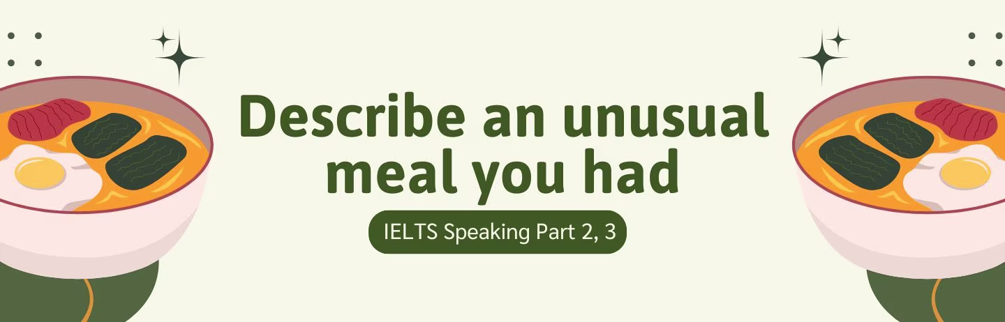 “Describe an unusual meal you had” là một chủ đề khá phổ biến thường xuất hiện trong phần thi IELTS Speaking Part 2 và 3. Khi bắt gặp chủ đề này trong bài thi, bạn cần phải mô tả về một bữa ăn đặc biệt và những trải nghiệm của bản thân bạn về bữa ăn này.