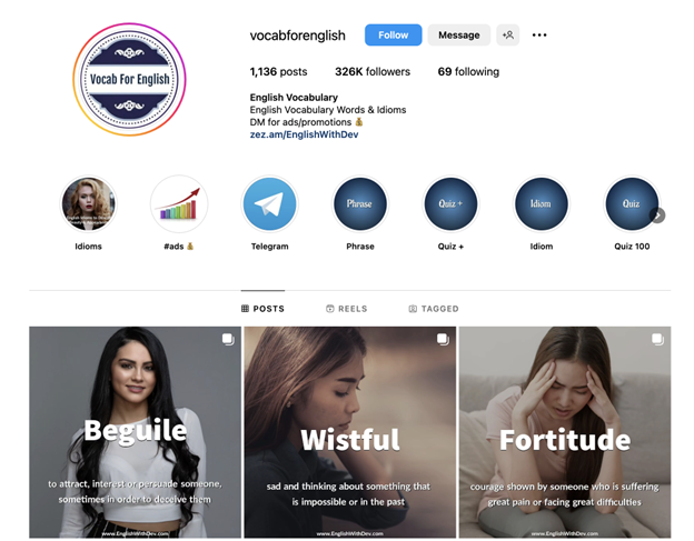 Nâng tầm từ vựng chỉ trong một bước với Vocab For English. Tài khoản Instagram giúp bạn học và hiểu những từ mới. Mỗi ngày, bạn sẽ được học từ mới trong mục “word of the day" kèm theo các hình ảnh minh hoạ để làm rõ nghĩa của từ, cho bạn cách dùng từ trong từng ngữ cảnh.
