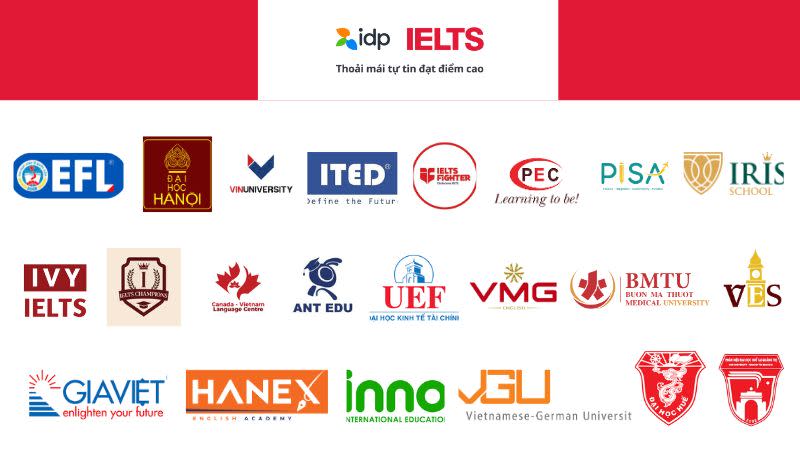Đối tác tiêu biểu của IELTS IDP bao gồm các trung tâm Anh ngữ, trường học, các tổ chức giáo dục và các giảng viên IELTS tại Hà Nội, TP HCM, Đà Nẵng và các tỉnh thành trên khắp cả nước.
