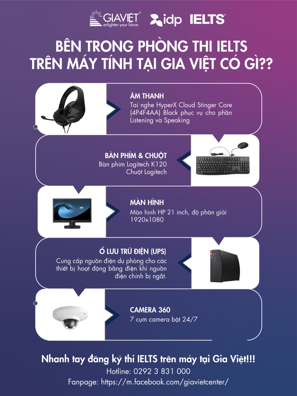 Địa điểm tổ chức thi IELTS trên máy tính đầu tiên tại thành phố Cần Thơ và đầu tiên tại khu vực Đồng bằng sông Cửu Long được toạ lạc tại tầng 8 của trụ sở chính Trung tâm Anh ngữ Gia Việt. Địa điểm thi được đặt tại số 39, đường Mậu Thân, phường Xuân Khánh, quận Ninh Kiều, thành phố Cần Thơ – nút giao giữa đường 3/2 (Trường Đại học Cần Thơ) và đường Nguyễn Văn Cừ (Trường Đại học Y Dược Cần Thơ). Với sức chứa tối đa 20 thí sinh cho mỗi ca thi, phòng thi được xây dựng với các trang thiết bị hiện đại đạt chuẩn quốc tế, bao gồm: